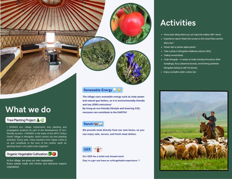 弊社が運営しているゲルツーリストキャンプは環境に優しい観光開発の一環として植樹プロジェクトを実地しています。また、自家製有機野菜栽培、家畜、再生エネルギー源としてソーラーパネルや天然ガスボイラーも活用しているので地球に優しいゼロエミッション❣ モンゴル旅行を満喫しながら、青い地球に貢献しましょう!