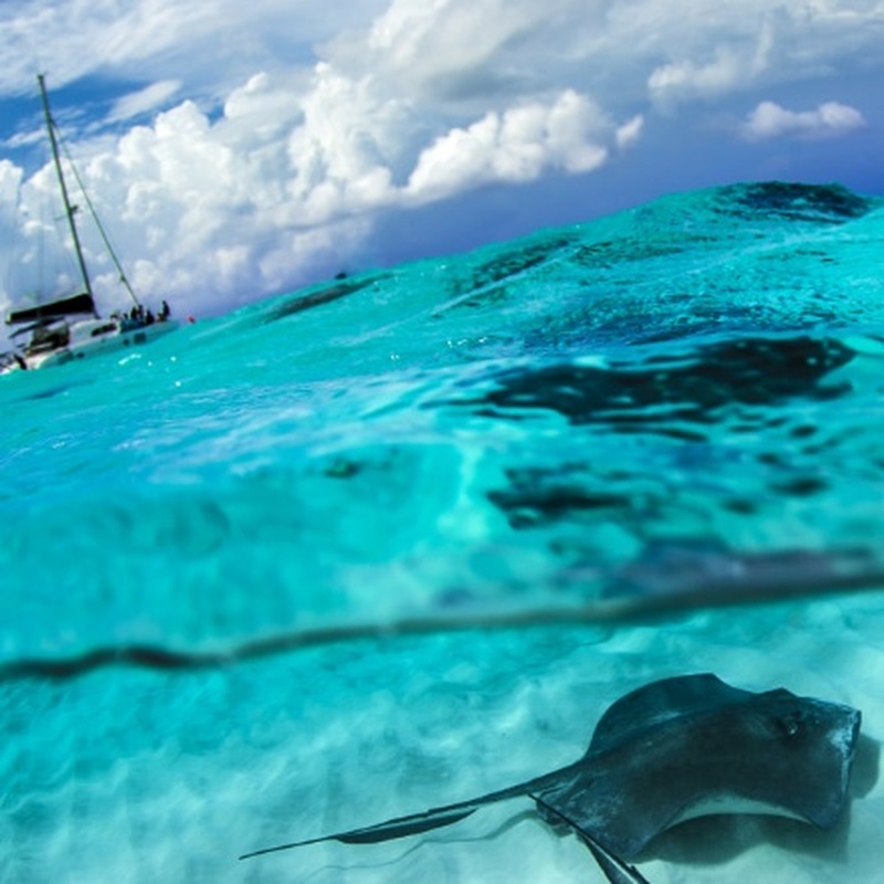 透明度の高い海でフレンドリーなスティングレーとふれあったり、エサをあげたりできます。