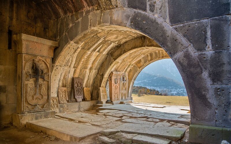 深い峡谷、赤茶色の岩肌、村々、旧ソ連時代の工場跡が混ざり合う独特の景観が特徴のアルメニア北部デベド渓谷。「他のコーカサスでは見たことがない“異世界感”がある」と評されるほどで、渓谷を走る道そのものが旅のハイライトといわれます。このデベド渓谷に建つサナヒン修道院とハフパト修道院は10〜11世紀に栄え、哲学・医学・音楽・写本制作などの学問の中心地でした。サナヒンは複数の教会、ガヴィット(拝殿)、鐘楼、写本室、王族の墓所が見どころです。ハフパトは周囲の景色を一望できる“眺望の修道院”として人気があります。ビザンツ様式とアルメニア独自の石造技術が融合し、中世アルメニア建築の最高峰とされています。