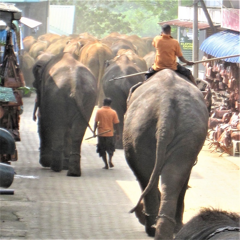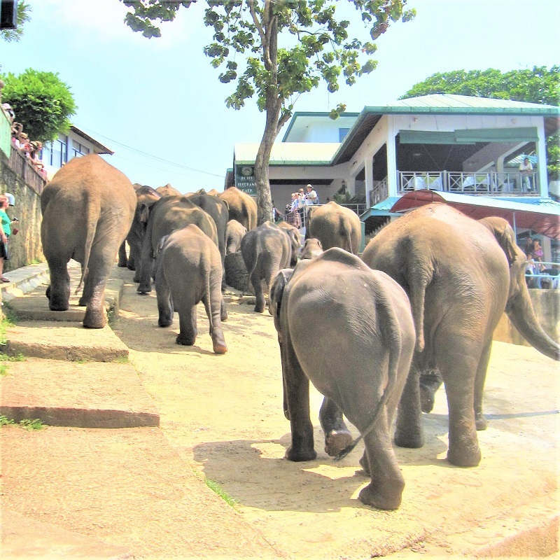 ここの人気は「ゾウの大移動」。孤児院の敷地内にいるゾウ達は、水浴びをするために川へ移動します。保護施設と川の間には一般道があり、ホテルやお土産物店が立ち並ぶ商店街があります。人々の目の前を何十頭ものゾウが通り過ぎていく様子は迫力満点です。ゾウの大移動を見た後は、川で水浴びをするゾウを見ながらご昼食を楽しんだり、紅茶やゾウの糞から作ったメモ帳など、ショッピングも楽しむことができます。