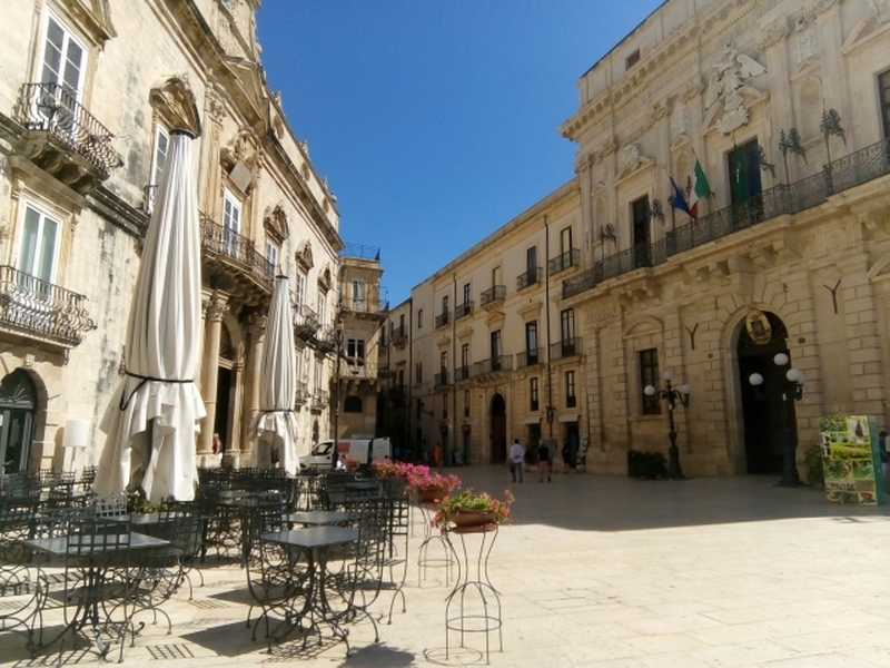 タオルミーナから車で約1時間半。シラクサはシチリア島の南東部の岬にある街で、新市街のある本土部分と、海に飛び出した格好のオルティージャ島で構成されています。数学者アルキメデスも紀元前287年にこの街で生まれ、太宰治の小説「走れメロス」の舞台としても知られています。紀元前5世紀には政治・文化の拠点としてあのアテネと競うほど栄えました。