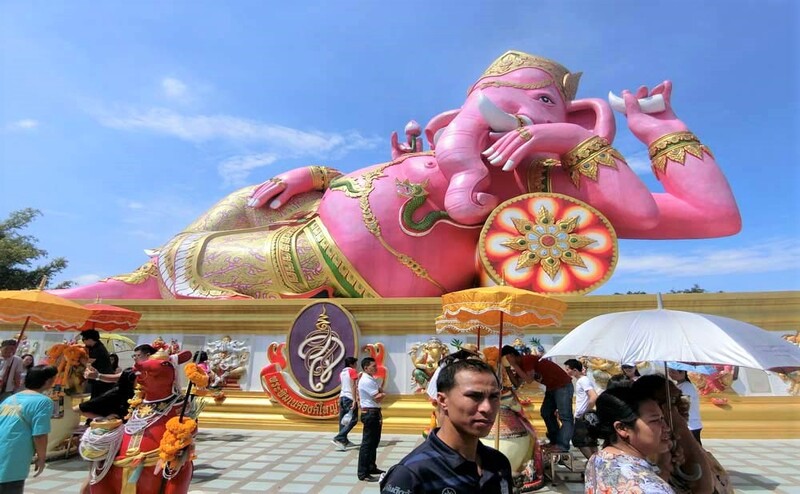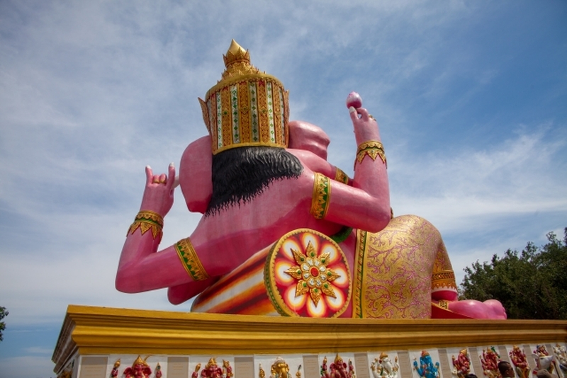 タイの寺院といえば厳かな雰囲気が漂うイメージなのですが、バンコクから西へ50km(車で1時間半ほど)のチャチュンサオ県にあるワット・サマーン・ラッタナーラームはそんなイメージを覆す様な明るい雰囲気のお寺です。2011年に一般的な参拝を目的に建立されました。ここには幅16m、高さ24mの巨大なピンクのガネーシャ像がある事でも有名です。敷地内には市場の様に出店があり、参拝すれば願いがかなうとされるこのお寺へのタイ人参拝客が多数。地元では有数のレジャースポットとなっています。ガネーシャは元々ヒンズー(バラモン)教の神様なのですが、 ここワット・サマーンは仏教寺院となんだか不思議な感じです。